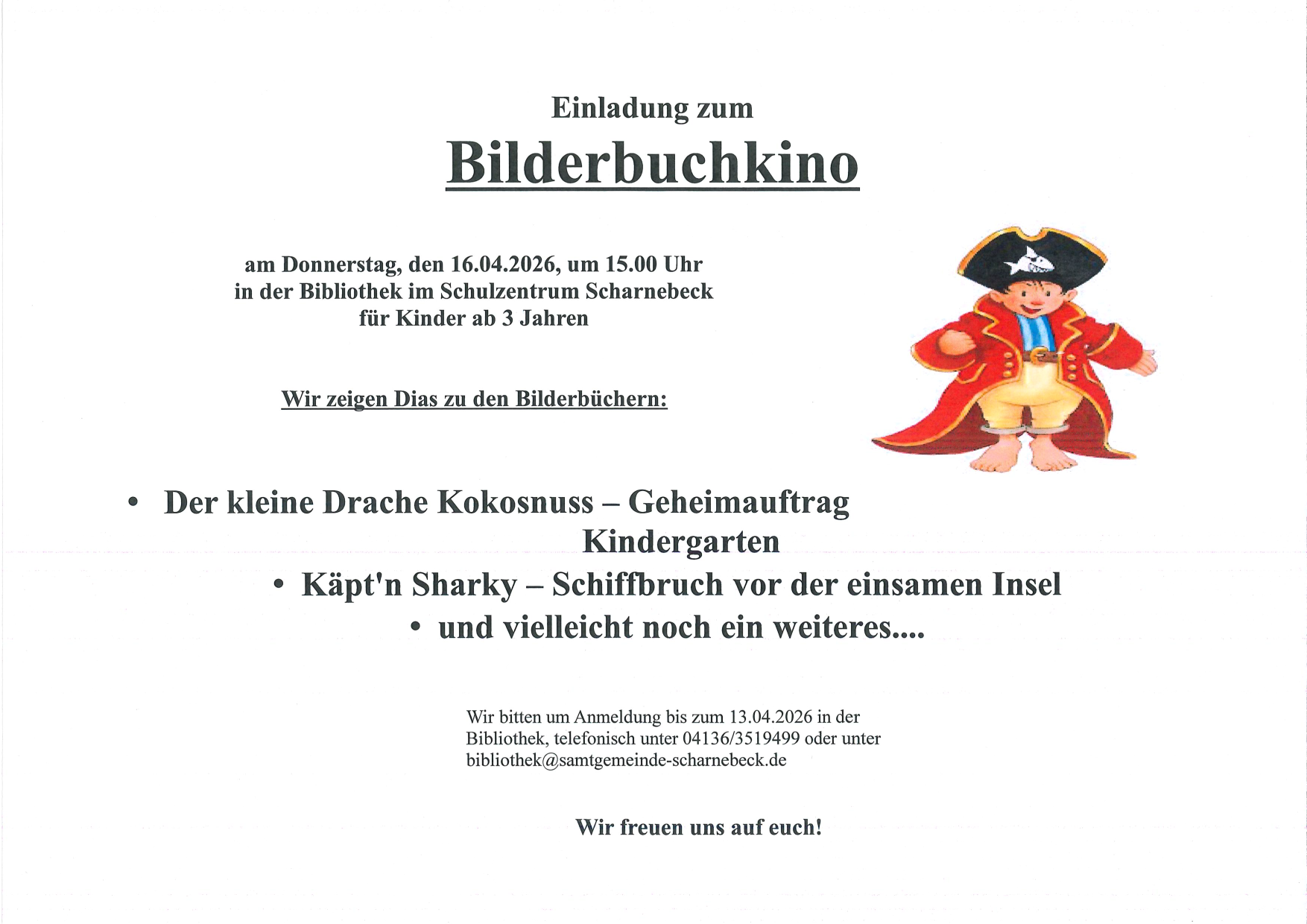 Anmeldung bis zum 13.04.2026 in der Bibliothek im Schulzentrum Scharnebeck, telefonisch unter 04136-3519499 oder unter bibliothek@samtgemeinde -scharnebeck.de